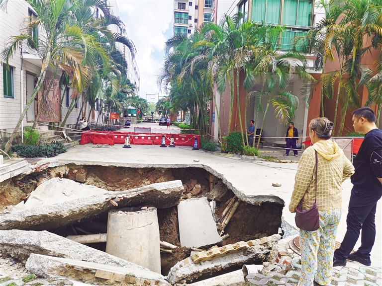 王海程表示,因为小区入口处路面下方是一条水利暗渠,最早塌陷发生在2021年10月份,当时事发后,相关市领导带着多个部门负责人连夜办公。后来,琼海市住建部门花了几十万元修缮。没想到2024年10月份,修缮区域又塌陷,路面严重下沉,2025年3月份相关部门又过来修了一次,但当时仅修下沉的路面。直到这次整个路面都塌陷下去了。