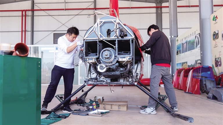 真正的突破,发生在2026年年初。在海南缮翼飞机工程有限公司的机库里,记者见到了执行董事关鹏,他正仔细查验一批进口航材。“今年1月,我们开启了3架R44直升机的高级别定检,这不仅是公司的突破,更填补了海南中部地区直升机维修保障的空白。”他的语气中带着自豪。他身后的工作架上,各类精密工具码放整齐,一架直升机被专业设备托起,两名技术人员正在对其旋翼系统进行深度“体检”。