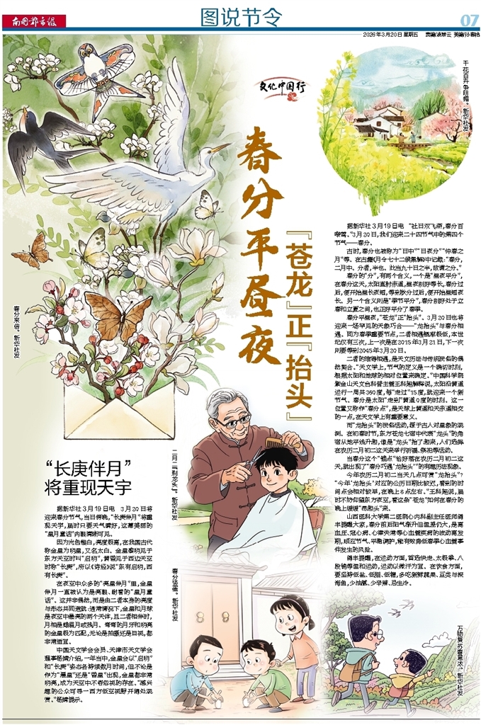 春分平昼夜,“苍龙”正“抬头”。3月20日也将迎来一场罕见的天象巧合——“龙抬头”与春分相遇。同为春季重要节点,二者相遇概率极低,本世纪仅有三次,上一次是在2015年3月21日,下一次则要等到2045年3月20日。