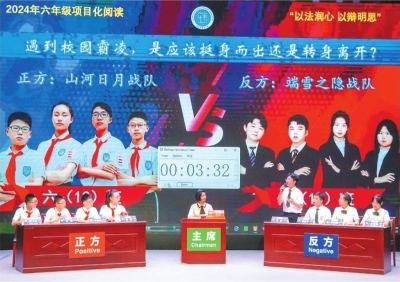 为深化学校“自适应平台全学科阅读”课题研究,该校坚持在各年级推进“6+N项目式阅读主题”活动。本学期,五年级项目式阅读主题为“遇见AI 共探未来”,六年级项目式阅读主题为“以法润心 以辩明思”。在学校文学社老师的指导下,全校33个班级围绕三个科创辩题、三个法治辩题展开了激烈的角逐,各班全员参与、全情投入,最终两个年级各有两个班级冲进了总决赛。