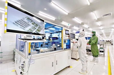 光迅科技的工程师在高速光模块生产线上查看订单完成情况。