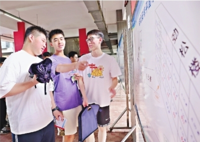 6月19日下午,七一中学考点内,中考考生们看考场。