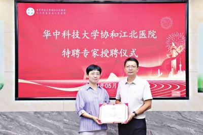 协和江北医院党委书记李红斌(右)为康复科特聘教授张敏(左)颁发聘书。