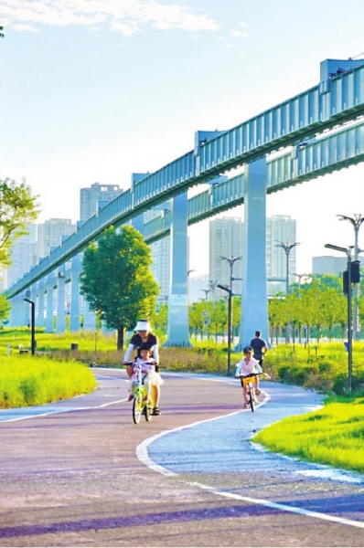 “看,空空!”2岁的小女儿突然指着上空的空轨喊道。大女儿则更加兴奋,她大喊着:“加油!我们快追上它了!”我们飞快地踩着踏板,试图与空轨上的列车保持同步。我也开了个玩笑:“能和空轨并肩骑行,City不City啊(网络热词,通常指洋不洋气,代指非常城市化)?”妻子答:“City呀!”哈哈哈,大家的笑声和欢呼声交织在一起。