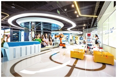 市民在江汉创谷参观机器人执行指令。 |