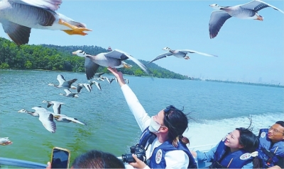 大雁在东湖伴飞,越来越丰富的动植物在此栖居。 景区供图 |