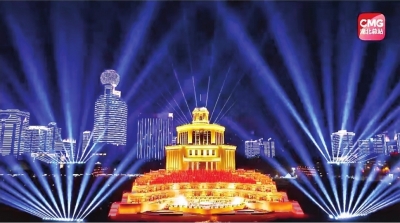 总台春晚武汉分会场主舞台之一 ——横渡长江博物馆上演华丽灯光秀。 总台湖北总站视频截图 |