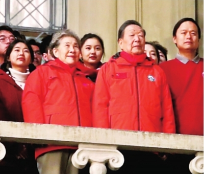 武汉大学行政楼前,李德仁院士和夫人朱宜萱教授站在前排,身后是500名武大青年学生。寒风中,大家激情四溢。“何谓英雄?江山留胜迹,我辈复登临”的声音响彻长空。