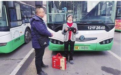 Y315路司机徐杰(左)把遗失物品归还乘客。 |
