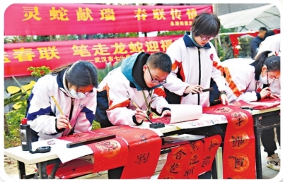 武汉市七一华源中学的学生们走进社区,现场挥毫泼墨,以送春联的方式表达对街坊邻里的美好祝愿。一副副春联翰墨飘香,犹如一抹暖阳为节日增添喜庆的色彩。该校负责人表示,通过社会实践活动让学生们学会感恩与回馈。