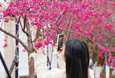 花博汇早樱盛放,吸引游客拍照。