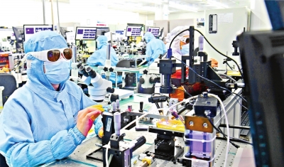 武汉锐科光纤激光技术股份有限公司生产车间,工作人员在精心操作仪器设备抓紧生产。 长江日报记者高勇 摄 |