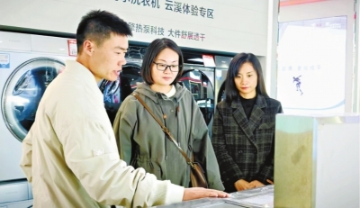 李志辉(左)向客户介绍家电。 长江日报记者郝天娇 摄 |