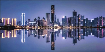 视频中,在夜幕将要降临的“蓝调时刻”,出镜人随着音乐、踩着轻快的步伐,从岸边向亲水平台走去。亲水平台延伸到湖面,画面背景是水域对面的林立高楼。灯光亮起时,高楼在湖面呈现出清晰的倒影。九派新闻记者粗略数了一下,画面中有40多栋高楼。算上它们在水中的倒影,可以说是近百栋高楼同框。楼群的灯光犹如繁星,打卡者仿佛站在群星中。