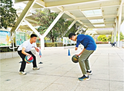 训练先从热身开始。几组折返跑、高抬腿后,小罗的脸上已微微发红。接着训练拍球技巧。在教练指挥下,小罗俯身挺直背,先训练原地拍球、左右手交换拍球,再模拟考场训练运动拍球。每过障碍杆,他的步伐会乱,教练指出问题并及时示范指导。一堂课70分钟,小罗完成训练已满头大汗。他说,他已上了3次课,觉得效果挺好的。“每次感受到自己的进步,我的自信逐渐建立起来了。”