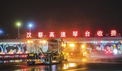 4月29日晚,城管环卫清洗汉蔡高速琴台收费站周边道路。 |