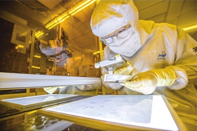 检测人员正在产品验证线的PI取向膜上进行框胶涂布。 |