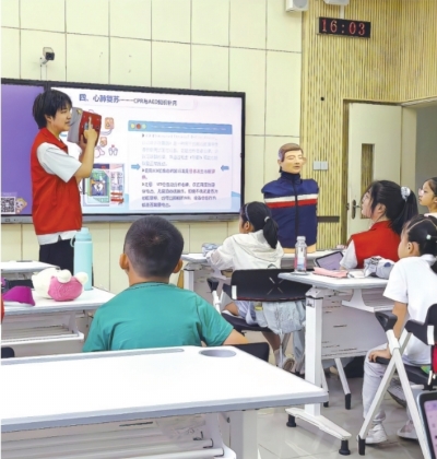 在“我是小小急救员”课堂上,志愿者系统传授安全知识:从如何识别池塘、深沟等危险水域到熟记中小学生“六不准”,从溺水后的自救技巧和科学施救方法到心肺复苏的完整操作流程……