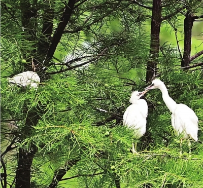 2025年6月12日,涨渡湖湿地公园,两只幼鹭在巢中等待食物。 |