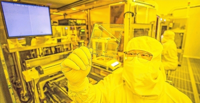 鼎龙研发人员正在检查产品验证线制作的test cell。 陈亮 摄 |