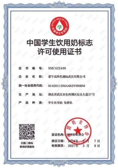 蒙牛低温(武汉)工厂“中国学生饮用奶定点生产企业”资质。 |