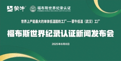 8月8日,FWRC福布斯世界纪录认证新闻发布会在蒙牛低温(武汉)工厂举行。发布会上,FWRC福布斯世界纪录认证官本·科特正式宣布蒙牛低温(武汉)工厂荣获“世界上产能最大的单体低温酸奶工厂”认证,并现场颁发证书。该项权威认证不仅是对蒙牛低温(武汉)工厂世界级规模与智能化水平的充分肯定,更是中国乳业以创新驱动发展、引领新质生产力建设的里程碑式成就,也彰显了蒙牛以世界级品质为中国青少年营养健康提供坚实保障的实力。
