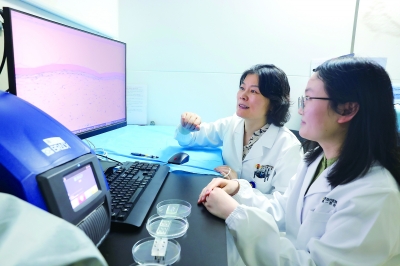 陈柳青教授(左)与团队成员讨论芯片上的皮肤组织形态。 |