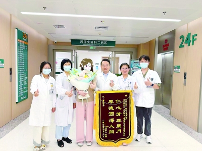 小星(左三)出院时给武汉市第一医院风湿免疫科医护团队送上鲜花和锦旗。 |