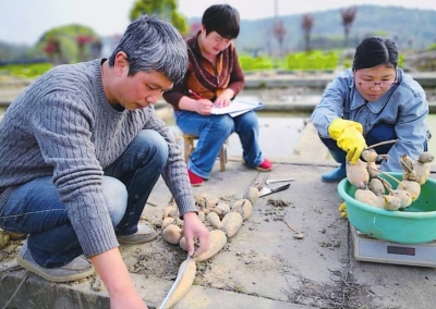 市农科院莲藕育种专家柯卫东(左一)和同事记录莲藕数据。 |