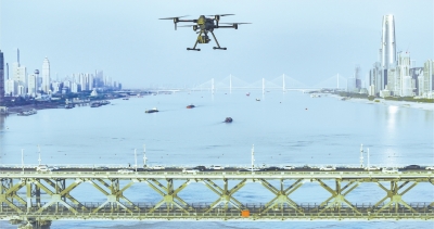 武汉无人机正从“看得见”向“用得好”跨越。图为普宙科技无人机S400在武汉长江大桥上空往上、下游方向进行测绘、巡检。 长江日报记者胡冬冬 摄 |