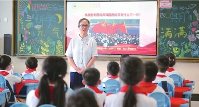 汉阳区钟家村明德小学党支部书记、校长杨敏为学生介绍抗战胜利80周年阅兵的精彩看点。 |