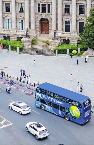 武网特色巡游双层巴士在江汉关前。