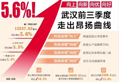 长江日报讯(记者陈永权)10月29日,武汉市统计局、国家统计局武汉调查队发布2025年前三季度武汉市经济运行“成绩单”。初步核算,前三季度全市地区生产总值(GDP)为15537.82亿元,按不变价格计算,同比增长5.6%,经济延续“稳中有进、稳中向好”良好态势。