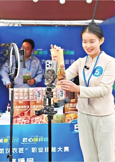 户外广场的农播客赛场,烟火气裹着活力扑面而来。选手们支起设备,洪山菜薹、汪集鸡汤、蔡甸莲藕、黄陂荆蜜等武汉特色农产品,直接变成直播间“流量密码”。“洪山菜薹紫红脆嫩,还含原花青素!武汉人冬天最馋的,就是妈妈炒的腊肉菜薹!”主播赵兰举着刚采的菜薹带货,吸引了不少粉丝下单购买。