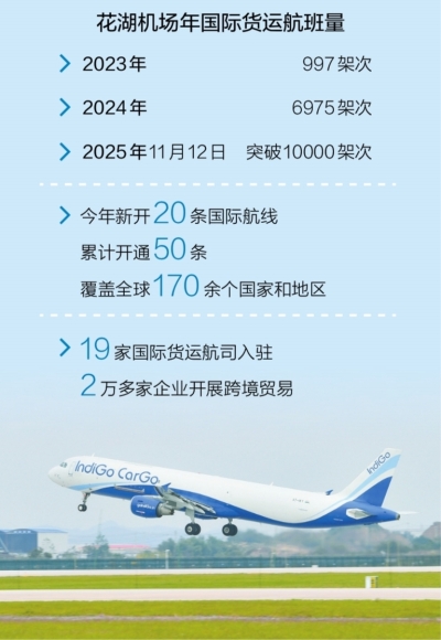 长江日报讯(记者刘海锋 通讯员刘小进 耿伟 李磊)11月12日15时58分,随着印度靛蓝航空6E8552次货机起飞,鄂州花湖国际机场(以下简称花湖机场)年国际货运航班量首次达1万架次,同比增长93.6%。自2023年4月开通首条国际航线以来,这座中部空港仅用2年7个月时间便迅速崛起,成为中国高端制造“出海”的关键门户。目前,花湖机场的货运航班量和国际货运航班量均位列全国机场前列。