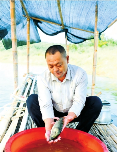 徐亚兵查看驯化的饲料鳜鱼生长情况。 长江日报记者刘帅 摄 |