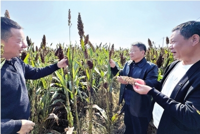 驻村工作队队长董怀刚(中)和村“两委”在高粱基地查看长势。 长江日报记者余康庭 摄 |