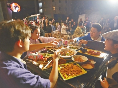 市民游客围坐八仙桌复刻老汉口宴席的经典场景。 |