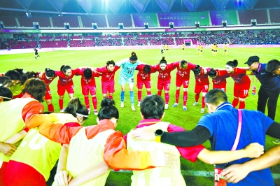 赛前,湖北女足队员围成一圈,相互加油鼓劲。 长江日报记者詹松 摄 |