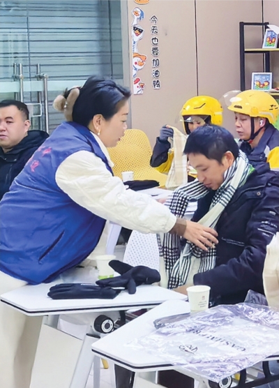 当天9时,20位小哥代表来到活动现场,大家领到围巾和手套套装后现场就佩戴好。“社区和志愿者太贴心了,这围巾和手套不仅暖和,更让我们心里热乎乎的,特别感谢大家!”外卖小哥潘李洋轻轻抚摸着围巾上细密的针脚,脸上露出了温暖的笑容,“这份礼物比什么都珍贵,让我们在奔波的路上感受到了家的温暖。”