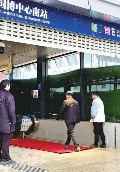 6号线国博中心南站电扶梯口铺设防滑地垫,乘客有序进站。 通讯员汤子豪 摄 |