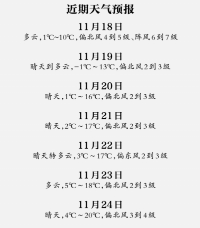 18—24日,我市以晴或多云天气为主,气温缓慢回升。24日最高气温升至20℃左右。