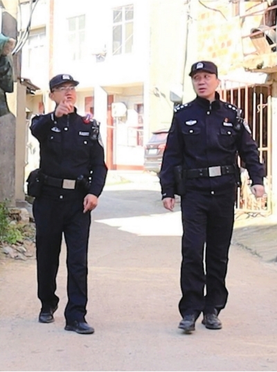 永安街派出所民警在覃太贵家附近走访。 长江日报记者夏奕 摄 |