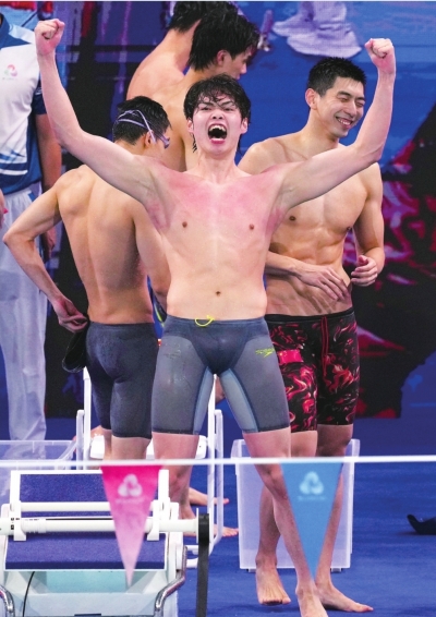 值得一提的是,担任最后一棒的自由泳选手徐海博来自武汉市少儿体校。赛后,徐海博激动地表示:“队友们非常给力,到我这棒时已经领先了,我绝对不会让别人把这块金牌从我手里抢走。一入水我就全力地拼,可以说是‘燃尽了’。终于拿到一块金牌,现在我的感觉非常好,也为全队队员感到骄傲。接下来,我还会继续刻苦训练,把能力提升上去,以后争取能参加自由泳接力比赛。”