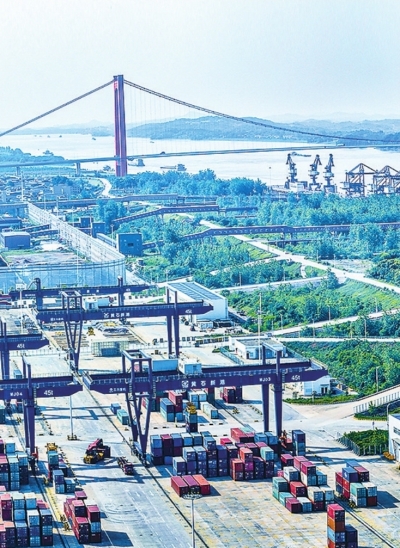 2014年,黄石将“以港兴城”作为城市转型发展的驱动引擎,与深圳盐田港开展战略合作。10年间,黄石以新港为核心,建成以“一高速一大桥一铁路四条一级公路”为骨架的“两纵五横”集疏运网络,同时通过快速通道打通港口与鄂州花湖机场的直连直通,实现铁、水、公、空多种运输方式高效衔接,加快打造长江中游多式联运重要节点。黄石新港与舟山港共建“江海直达+多式联运”模式,还被列为国家第二批多式联运示范工程。