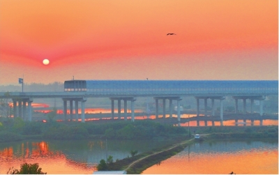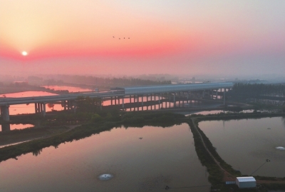 11月15日,一只苍鹭从声屏障上方飞过,与冉冉升起的一轮红日同框。 |