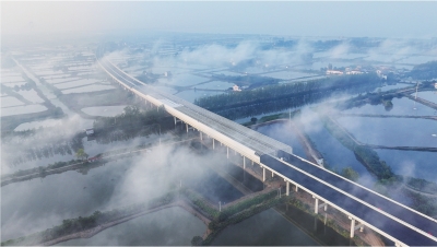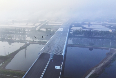 双柳长江大桥北岸接线工程毗邻涨渡湖湿地自然保护区,400米长的声屏障在水汽蒸腾中格外醒目。 |