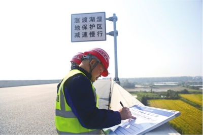 进入涨渡湖湿地自然保护区腹地,水网密布,苍鹭、大白鹭惬意地在池杉林栖息。截至2025年1月18日,该地区鸟类名录共收录野生鸟类225种。其中,包括国家一级保护野生动物3种,国家二级保护野生动物33种。每年有2万多只水鸟在此越冬。大桥设计之初,设计者就曾修改线路,向外绕道一公里,避让保护区核心区。2020年,大桥设计人员补充调查,邀请专家给出鸟类生态影响专题评价。这座全封闭式声屏障,正是据此设立的。