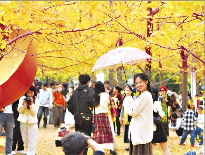 11月16日,华中科技大学的银杏林,学子们驻足拍照、拾叶制作书签,留下一段金色记忆。 长江日报记者高勇 摄 |