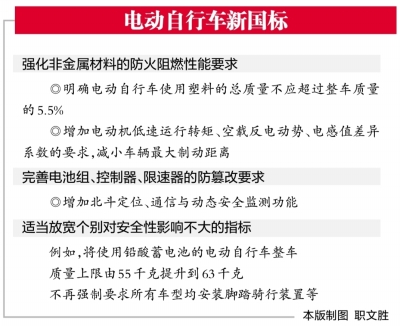“比如,将铅蓄电池车型整车重量限值由55千克放宽至63千克,满足消费者续航里程需求;不再强制安装脚踏骑行装置等。”中国电子技术标准化研究院安全技术研究中心副主任何鹏林说,新标准还要求电动自行车具备北斗定位、通信与动态安全监测功能,以及时应对车辆被盗、温度过高或蓄电池电压过高等异常情况。